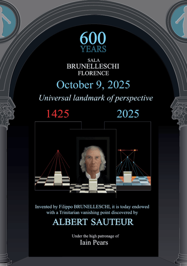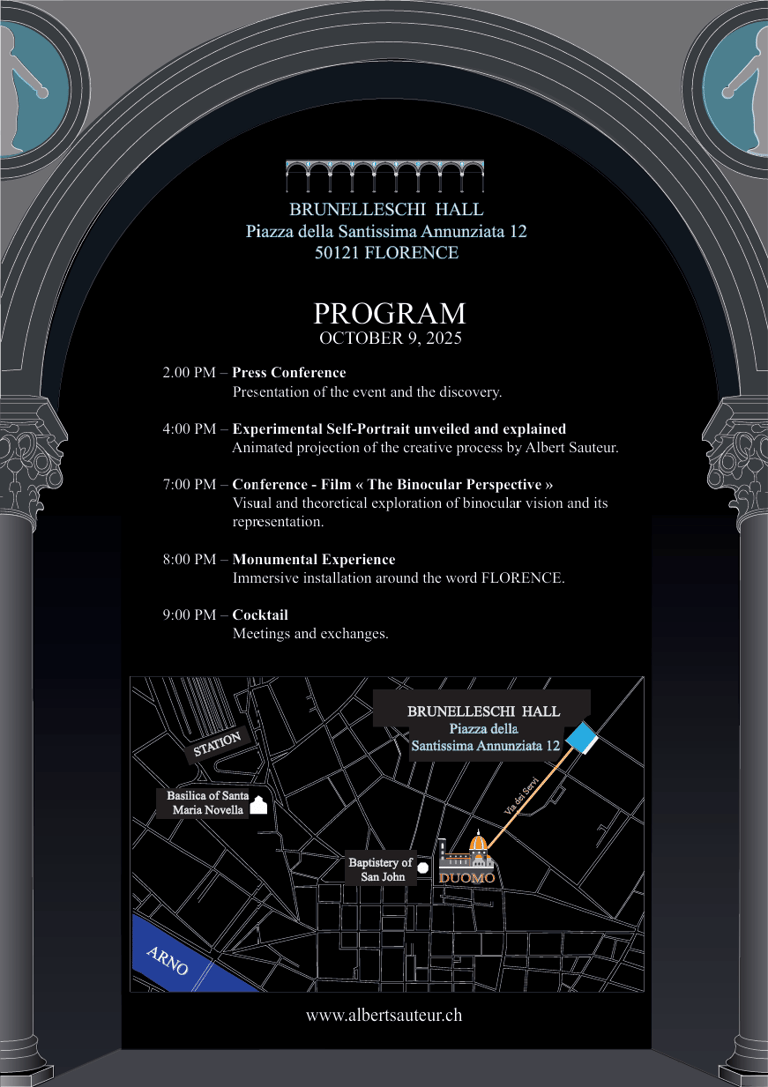 On October 9, 2025, Albert Sauteur will present his discovery of binocular perspective in Florence, 600 years after Brunelleschi’s discovery of traditional perspective in 1425.
